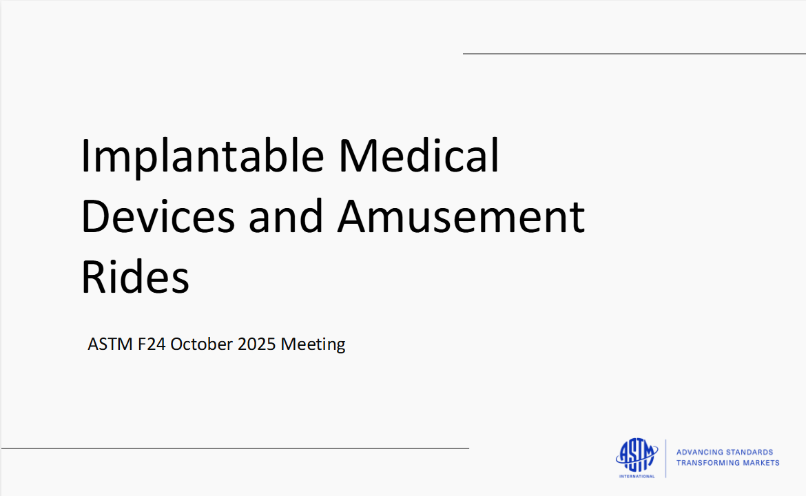Under the leadership of Chris Rose, I with other university volunteers researched the potential hazards associated with amusement rides and devices and identify common implantable medical devices a guest may have at any given time and presented our findings in ASTM F24 meeting in October 2025.
